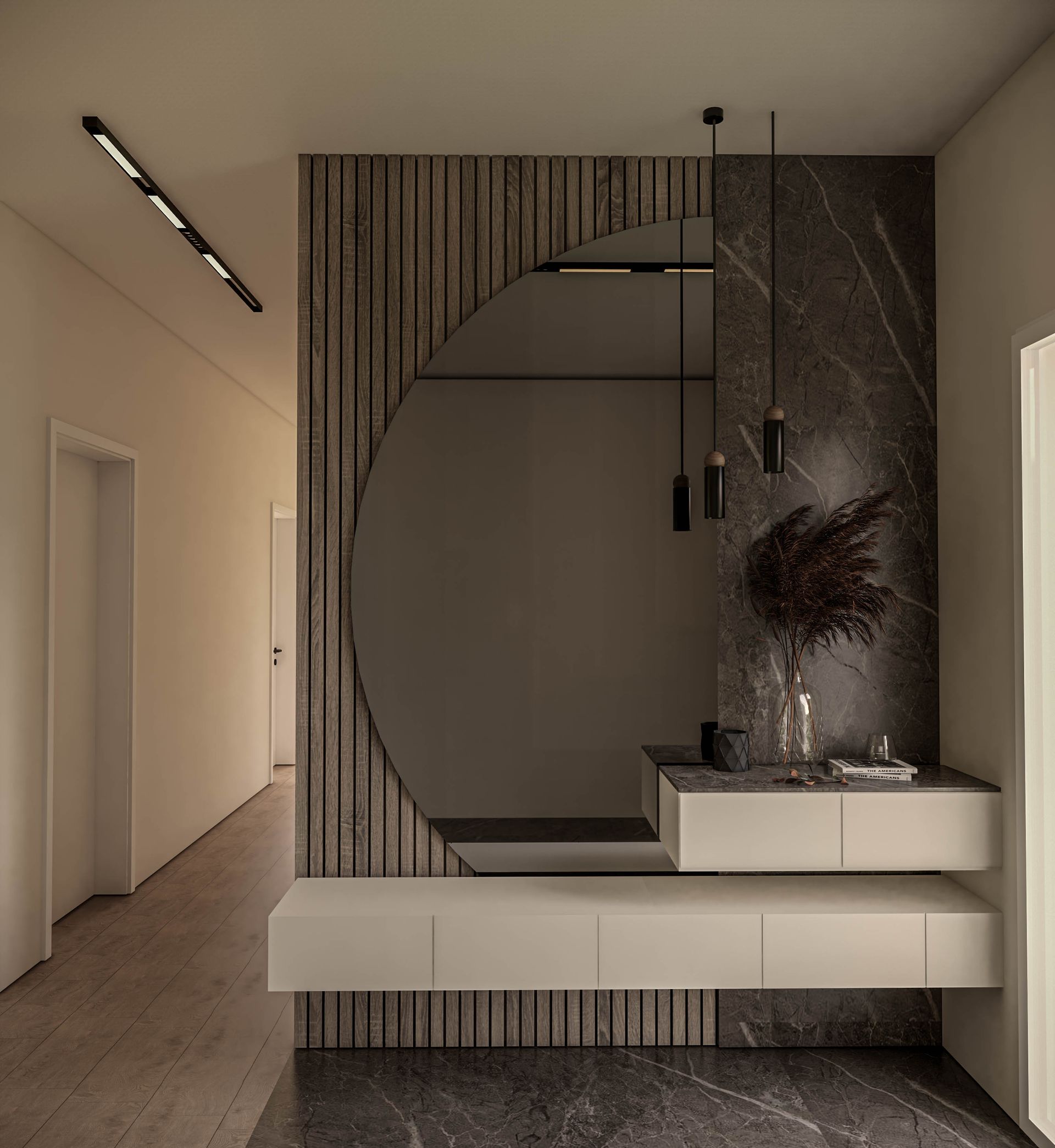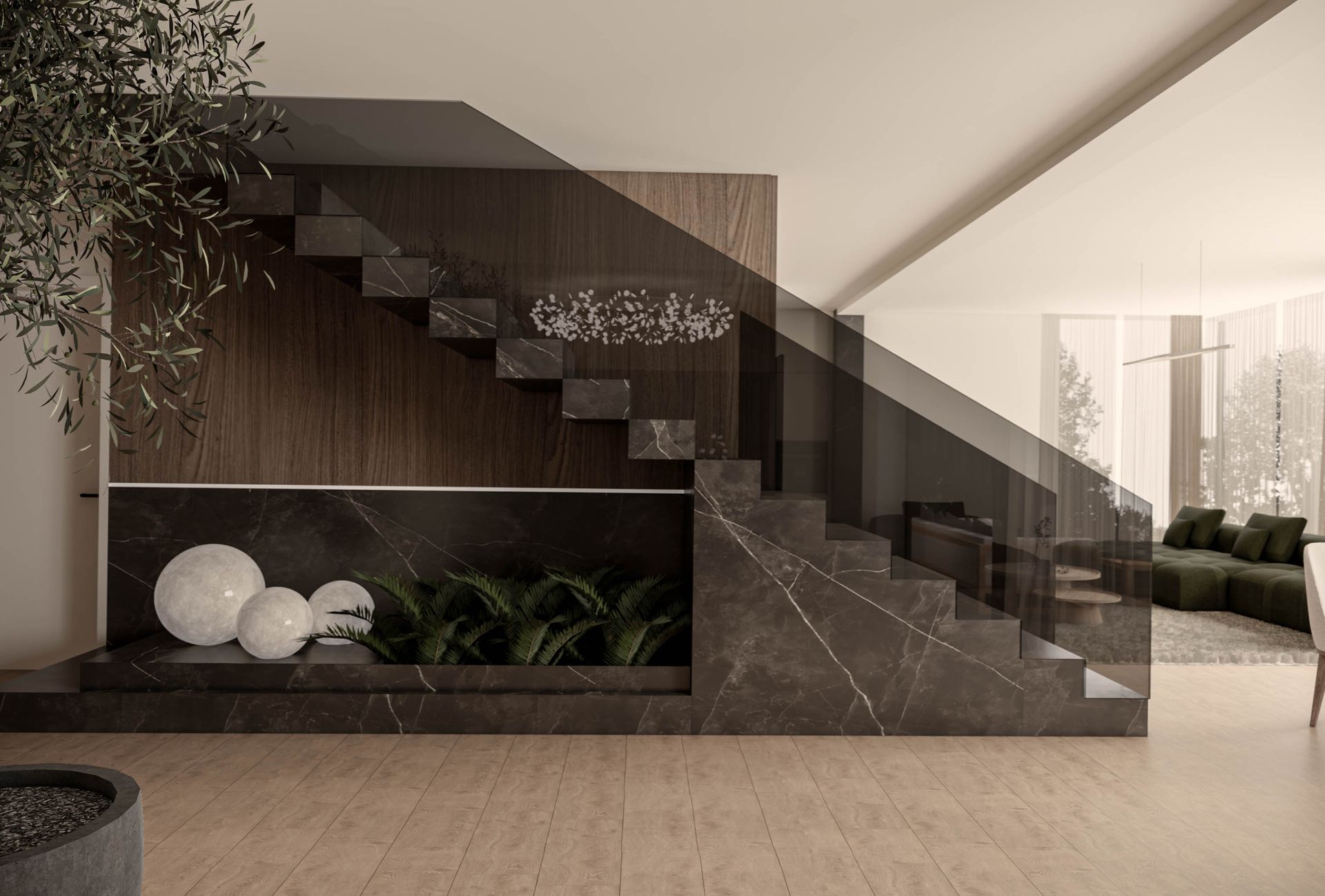 V celotnem domu smo uporabili zemeljske tone, ki se prepletajo z naravnimi materiali, kot so les, marmor in kamen. Kontrast črnih detajlov prostoru doda sodobno noto, medtem ko nevtralne barve ustvarjajo toplino in harmonijo.