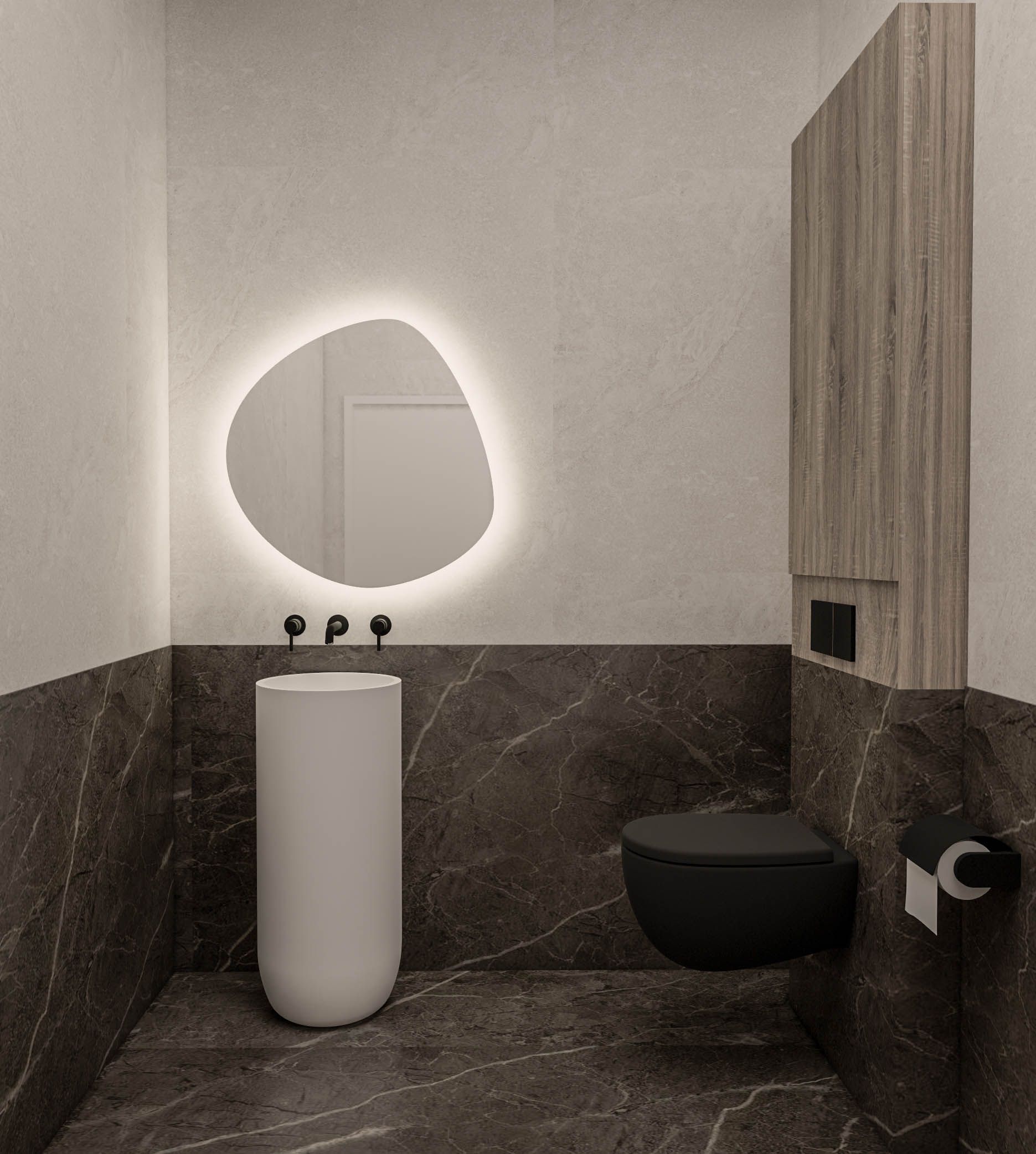 Kopalnice v hiši odražajo prefinjen minimalizem. Temni kamniti elementi v kombinaciji z lesenimi detajli in črnimi armaturami ustvarjajo moderen in razkošen videz. Poudarek je na funkcionalnosti z dovolj odlagalnih površin in prostornimi prhami.
