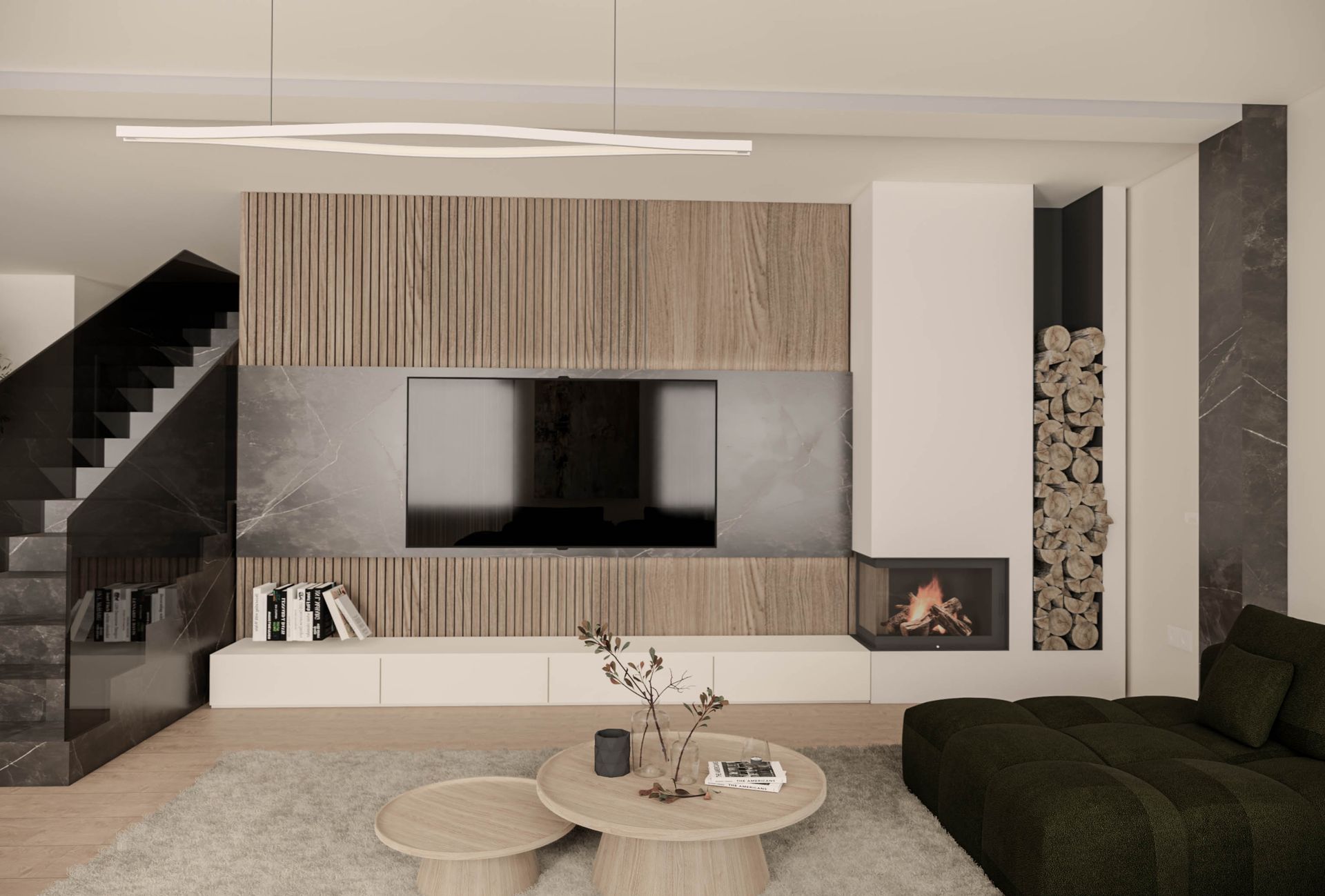 Dnevna soba je opremljena s prostorno sedežno garnituro, ki nudi udobje za družinske večere. Osrednja stena je obložena s kamnito teksturo, ki prostoru doda kanček naravnega šarma. Kamin, služi kot topla in privlačna osrednja točka prostora. Dekorativni dodatki, kot so preproge in blazine v zemeljskih tonih, pa zaokrožajo prijetno vzdušje.