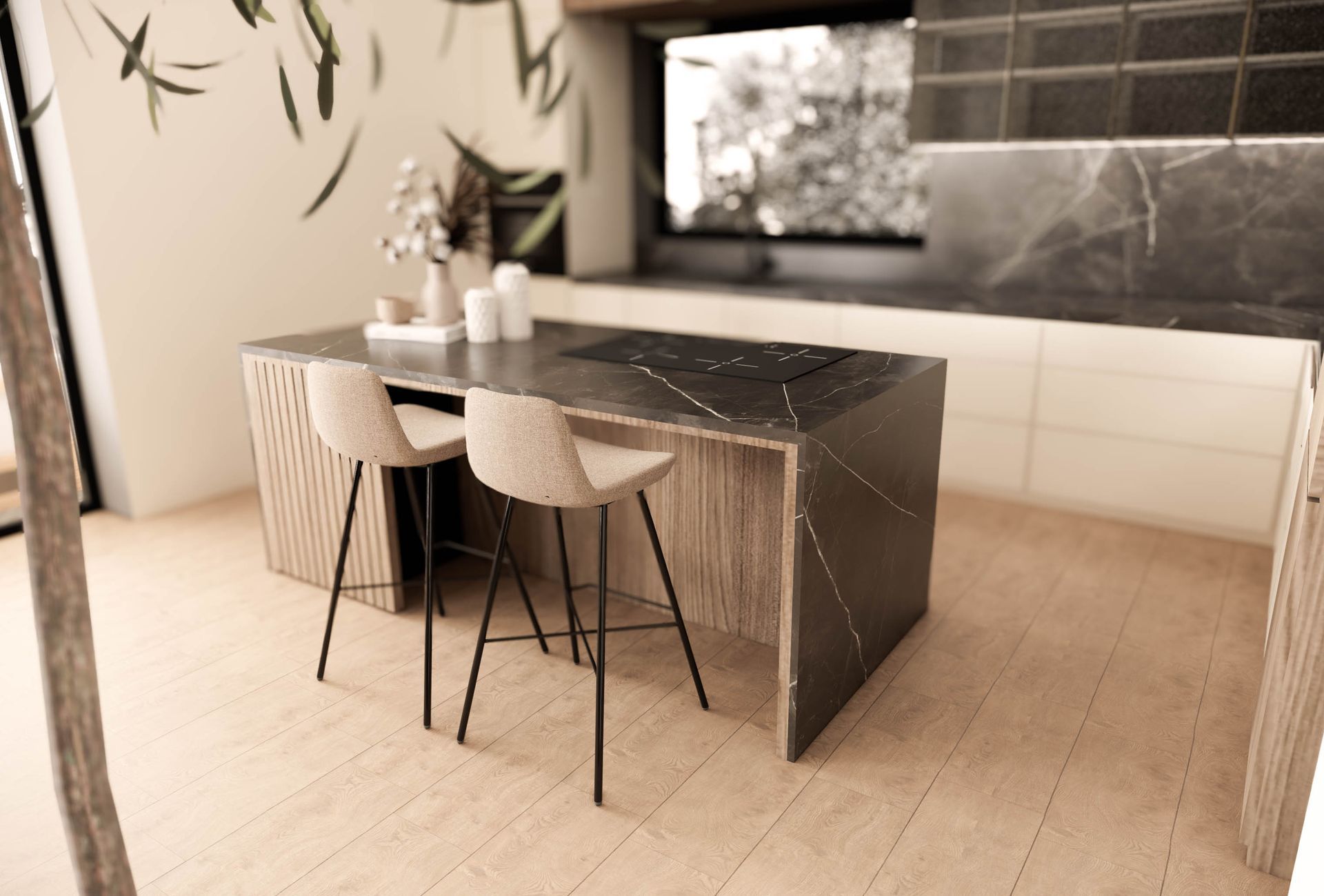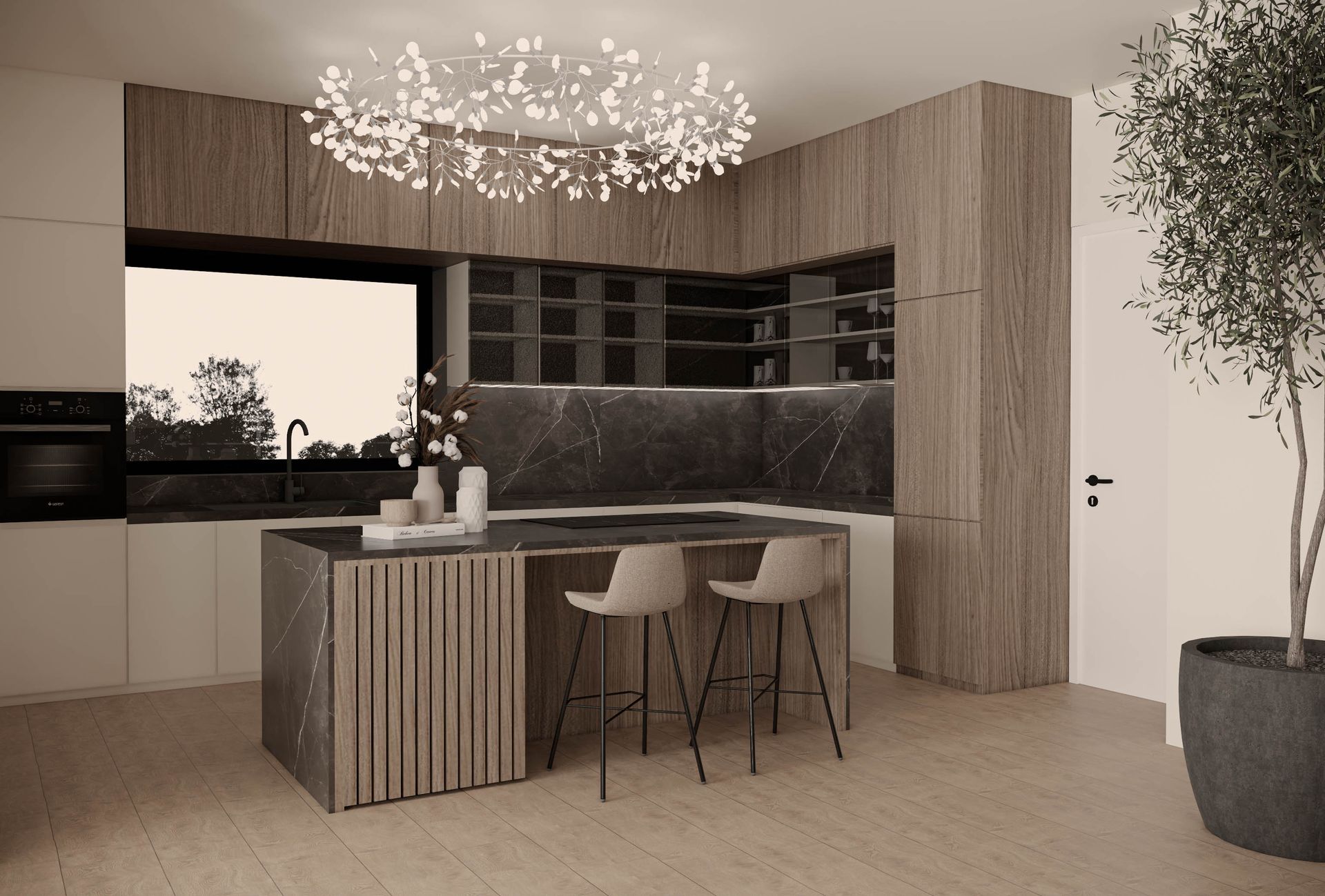 Osrednji del hiše je odprt dnevno-bivalni prostor, kjer se prepletajo dnevna soba, kuhinja in jedilnica. Kuhinjski otok, obložen s temnim marmorjem, je postal srce prostora in ponuja dovolj površine za pripravo obrokov ter priložnosti za druženje. Leseni elementi v kombinaciji z modernimi črnimi detajli, kot so ročaji in svetila, dodajo občutek topline ter ustvarijo brezčasno eleganco.